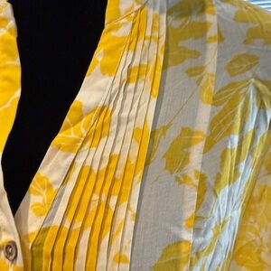 Chic Maeve blouse with vibrant yellow floral design. Button-down front. Ideal for casual or dressy looks.