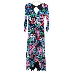Make summer memories in this occasion-ready maxi dress, where vibrant florals and a playfully ruffled hem offer equal parts sweetness and sophistication. Features long ruched sleeves, a high-low hem, a V-neck and open key hole back with two button closures at the neck. Finished with a hidden back zip.