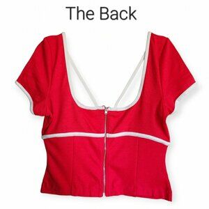 New with tags Anthropologie Maeve Sweetheart Ponte Top features a red and white colorway in a medium size for a contemporary look. Crafted with viscose, nylon, and elastane, providing a structured fit with a back zip for ease.