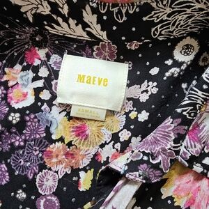 Maeve shirt with vibrant floral patterns. Features a mix of colors on a dark base.