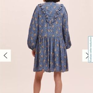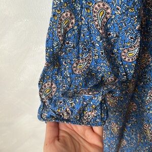 Anthropologie Maria dress, blue paisley ruffle bib prairie long sleeve midi M