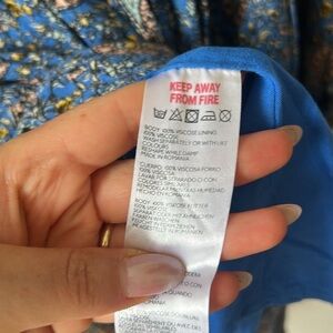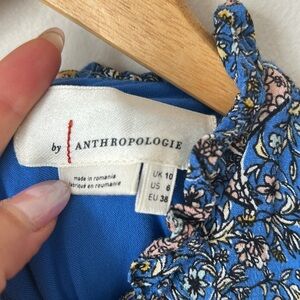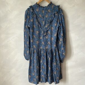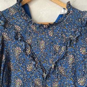 Anthropologie Maria dress, blue paisley ruffle bib prairie long sleeve western