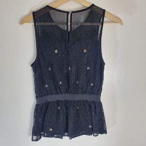 Anthropologie Meadow Rue Black Lace Sequined Sheer Collar Sleeveless Peplum Top