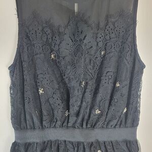 Anthropologie Meadow Rue beautiful sequin clusters and Lace with eyelash fringe, sheet upper neck and shoulders with keyhole closure at near of neck. Elastic waistband cinch, too flares out below like a peplum shape. Everything below the sheer collar area is fully lined. Excellent preloved condition no stains or tears.