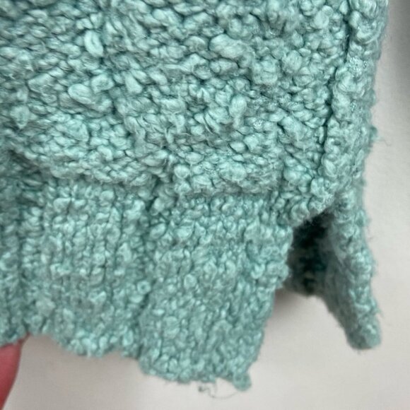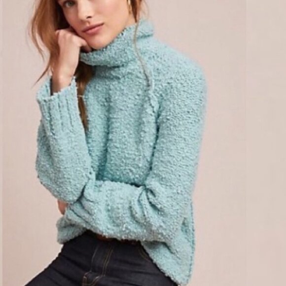 Anthropologie Moth Juliette Knit Turtleneck Sweater in a Teal Green / Blue Colour and Women's Size Small. Boucle texture. Slightly bell sleeves. With coziness to spare this super soft nubby turtleneck ensures you stay chic even on the greyest of days. Cotton / poly / rayon / nylon. Very good pre-loved condition. No visible flaws. Extra thread attached to care tag.