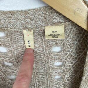 Anthropologie Moth Beige Tan Cardigan Knit Sweater in Women's Size XS. 55% Cotton, 21% Acrylic, 13% Nylon, 10% Wool and 1% Spandex. 3/4 sleeves. V-neckline. Asymmetric hem. Machine washable. Very good pre-loved condition. No visible flaws.