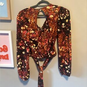 Chic floral blouse with vibrant multicolor design. Features long sleeves and open back. Perfect for stylish events.
