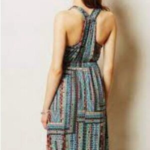 Flowy bohemian dress with a multicolor pattern. Sleeveless design with a high-low hem. Soft and flowy. POCKETS!!