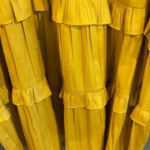 Chic mustard blouse with ruffle details. Sleeveless design. Perfect for layering or solo wear.
