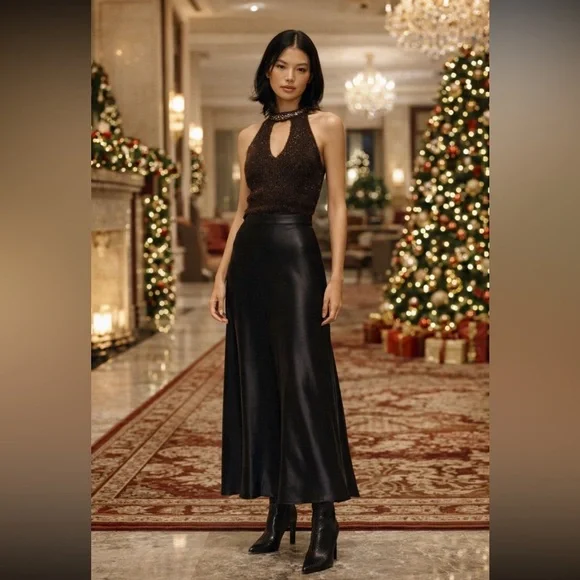 This Maeve tank top features a sleek cut-out design in a rich brown hue, offering a fitted silhouette that flatters the form. The high neck and sleeveless style create a modern, minimalist look, perfect for adding a touch of sophistication to any outfit.