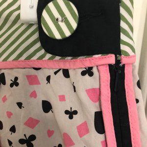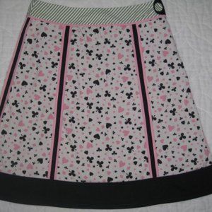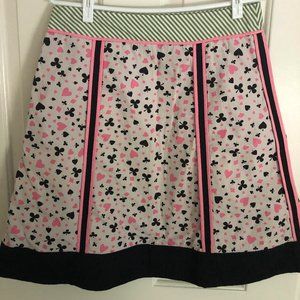 Anthropologie's Odille brand, A-line 'Ace of Spades' Skirt. 100% cotton. NWOT. Never worn. Size 6. Beautiful slightly heavier cotton, works for spring, summer and fall, with full black cotton lining integrated (sewn to skirt) so no undergarments will show through. Runs a little bit big. Hidden side zipper closure and functioning large decorative button. Measurements as follows: Waist: 15" across lying flat; Length waist to hem: 22.5". A-line (bottom hem) width: 27" across lying flat.