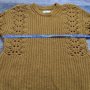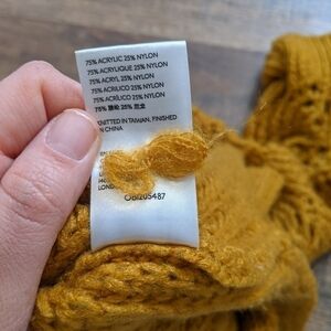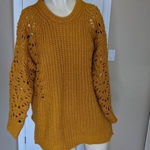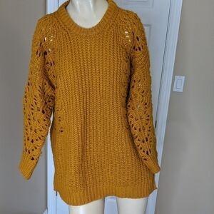 burnt yellow knit sweater with cut outs along the arm. comes with extra string attached inside . comfy casual