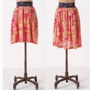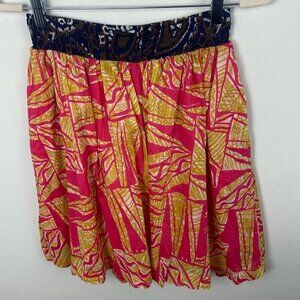Anthropologie Vanessa Virginia Pink and Mustard Yellow Mini Skirt in Women's Size 4. Elastic waist. 100% cotton. Has pockets. Machine washable. Very good pre-loved condition. No visible flaws.