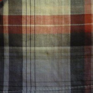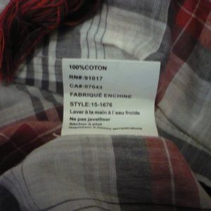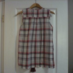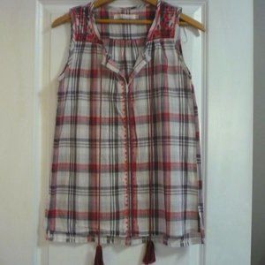 Excellent preowned condition, grey, red and white plaid Solitaire tunic tank top with matching grey and red tassels. Fabric is a bit on the thinner side, making it a perfect top for summer.