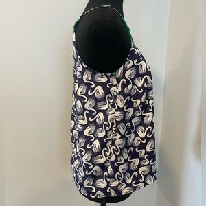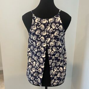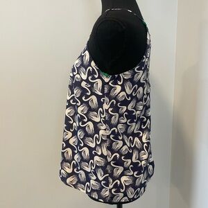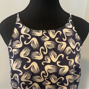 Anthropologie Porridge navy blue and white swan print top in a size XS. Lightweight with spaghetti straps and an open back detail. Fully lined with a boho vibe. In excellent condition with no pulls, stains or visible flaws. But please note there is a small tear at the side seam inside the lining, it’s not visible during wear, see last picture.