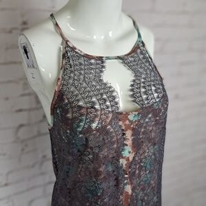 Smokey lace overlays ocean hues on this silky keyhole halter.