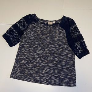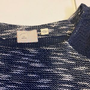 EUC Postmark navy blue and white knit top with lace short sleeves from Anthropologie in women’s size medium.
