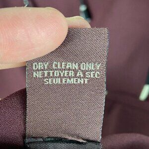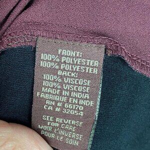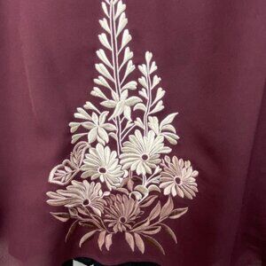 Burgundy maroon colour (model photos in green to show fit). Embroidered polyester front, woven viscose back. Tie neck. Pullover styling. Dry clean. Very good pre-loved condition. No flaws.