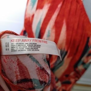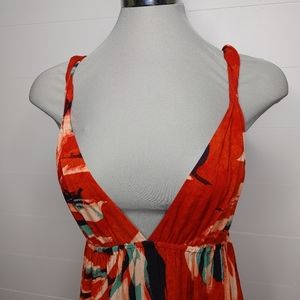 Vibrant red midi dress with blue and white abstract patterns. Features a flowy silhouette and strappy back design. Perfect for summer outings.
