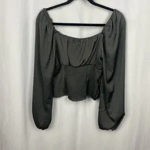 Lightweight and satin inspired blouse with long bubble sleeves and a square neckline.