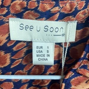 Make a bold fashion statement with the Anthropologie See U Soon Orange Navy Blue Splotch Animal Print Blouse in Size Small. This blouse effortlessly combines vibrant colors, a unique print, and contemporary style for a look that is both playful and sophisticated.