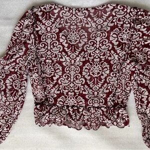 ANTHROPOLOGIE, WOMEN'S SMALL, SHEER JACQUARD PEASANT BOHO WINE PRINT BLOUSE, NWOT.