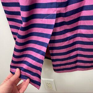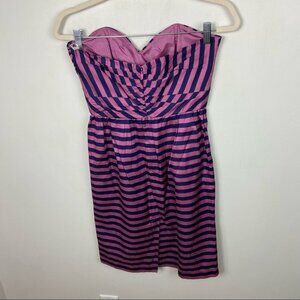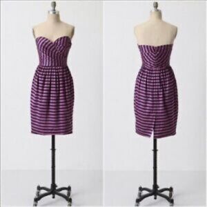 Anthropologie Corey Lynn Calter On The Fold Strapless Dress in Purple and Women's Size 4. Flirty and sophisticated dress in a sporty plum purple and navy stripe. Boning in corset for shape and support. concealed back zipper. Gathered bodice. 55% silk and 45% cotton. Fully lined. Very good pre-loved condition. No visible flaws.