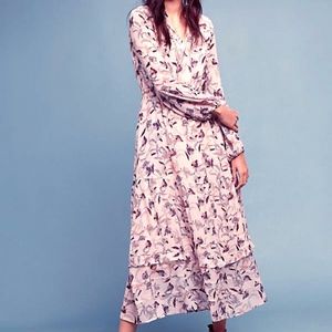 The Frances Dress is a long sleeve split neck pullover maxi dress with a ruffled neckline, neck ties finished with handmade tassels, a gathered waist, elasticated sleeve opening, and tiered skirt with ruffle detailing. 100% Silk.