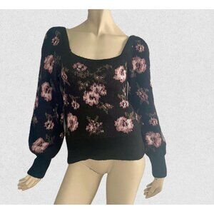 Anthropologie sweater. Feminine puffed long sleeves, square neckline. Black with pink flowers.