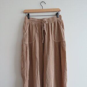 Comfortable wide-leg pants. Elastic waistband with drawstring. Relaxed fit.