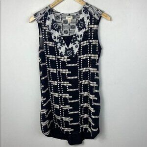 Anthropologie Tiny Chapparal Tunic in Women's Size XS. Beautiful black and white sheer print. V-neck. Sleeveless. Poly / tencel/ modal / spandex. Hand wash cold. Very good pre-loved condition. No visible flaws.