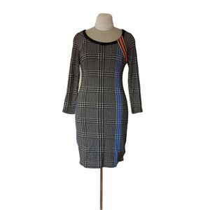 This is long sleeve shift dress in a black and grey houndstooth pattern stretch7 knit by Tracy Reese.