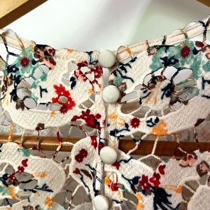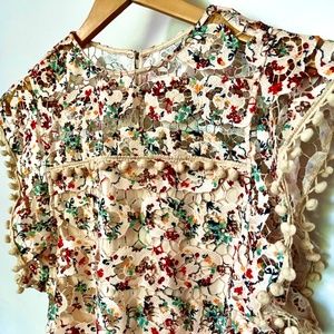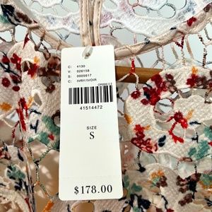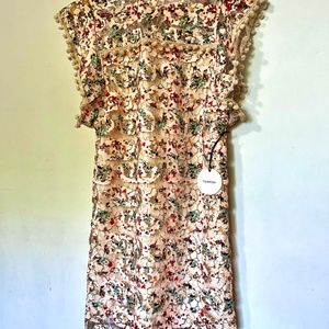 Beautiful New with tags Anthropologie Tularosa Dress size Small. Ivory with multicoloured floral pattern overlay and Pom fringe. Loop buttons in the back.