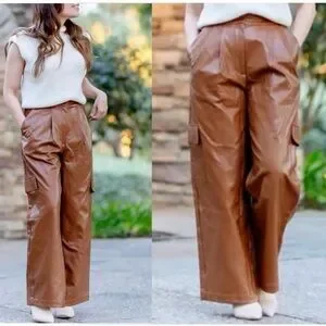 vegan leather wide leg pants, faux leather cargo pants, brown utility pants, Anthropologie wide leg pants, cargo pleather pants, women's utility pants,