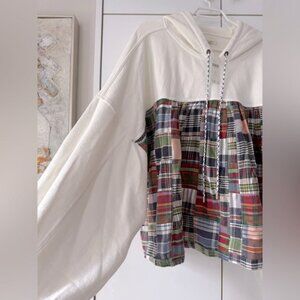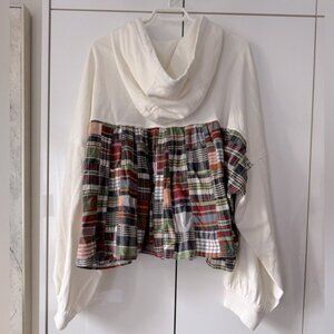 Stylish top with a white hooded design. Features a multicolor plaid pattern on the back. Perfect for casual wear.
