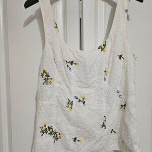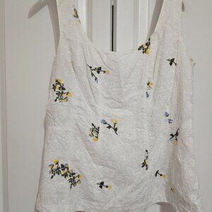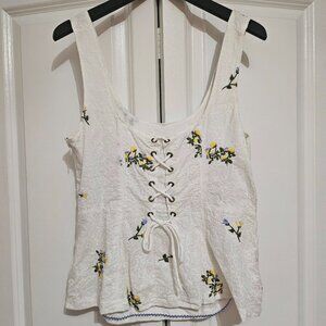Fully lined, white cotton top. Exquisite embroidered flowers, plus back corset detail!