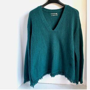 Anthropologie Wool Alpaca V-Neck Sweater Green Fringe Long Sleeve M