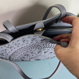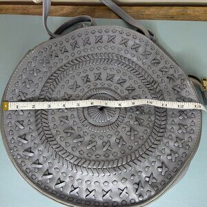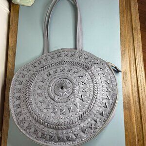 Anthropologie round woven tote bag in powder blue sundial type pattern. Attached zippered coin purse. Top magnetic closure.