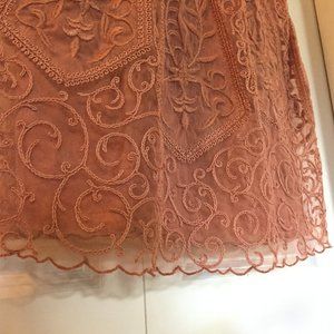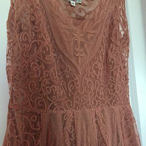 Great colour on this dusky rose dress with lace embroidery. The dress includes the lacey outer layer with a matching slip (fully detachable).