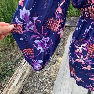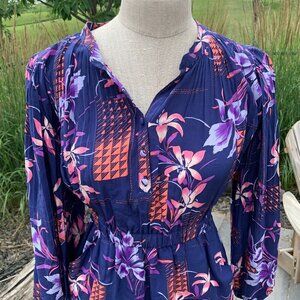 Yumi Kim Anthropologie lightweight silk chiffon tropical floral print puff long sleeve above the knee mini babydoll dress. Pockets, royal blue with purple pink orange flowers, elastic waistband for a cinched look, pleated upper, v-neck with button front, fully lined. Please reference pictures for missing top buttons
