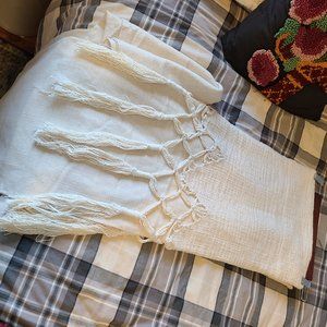 100 % cotton bohemian style curtain panel. Unused. 95" long, 51" wide. Would look great swooped to the side on a narrower window!