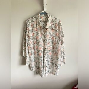 Anthropologie Enchanted Garden Button Up Floral Top Tunic Oversized Size M. Long-sleeved floral embroidered button up white orange black lightweight cotton no stretch Oversized (can fit M/L)