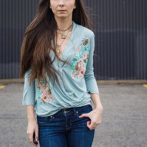 Pale green in a soft jersey knit top with a faux wrap front and embroidery on both sides including some sequins. Excellent condition. Material allows some stretch.