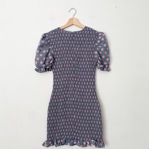 Blue smocked dress with hidden back zipper, puff sleeves and polka dot print.
