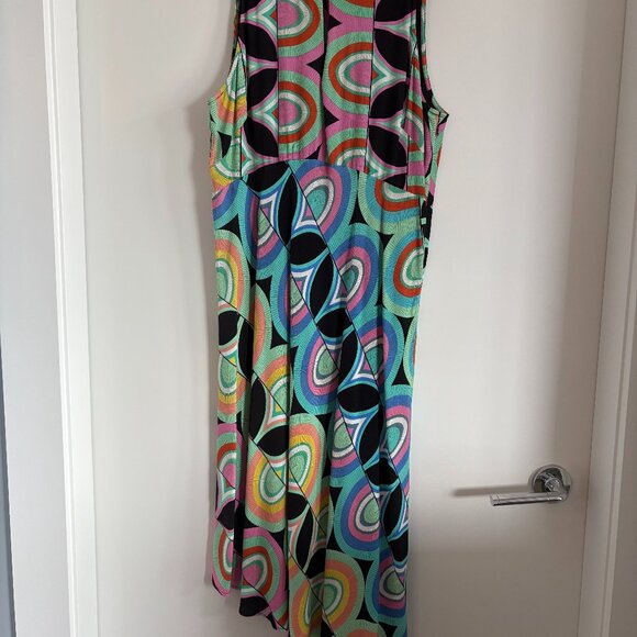 Anthropologie multi-colour dress with asymmetrical hem. Peek-a-boo v-neckline with side zipper. Fully lined - 100% viscose fabric