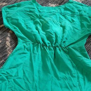 Lovely emerald green silk top. Sleeveless pullover design with ruffled V-neck. Some elastic at waist. Great condition.