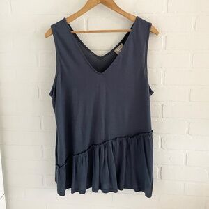 Sleeveless blouse top / tank top - shade of blue gray. Has hints of ruffles that go diagonal on the front of the shirt.