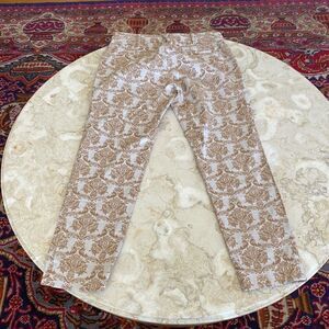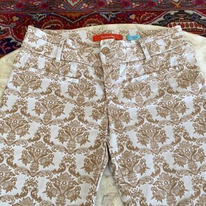 In very good preowned condition beautiful Cartonnier Charlie ankle slim pants from Anthropologie. Gorgeous brocade pattern in tan over a light cream base, zip and button front closure, belt loops, slit front and back pockets (all still stitched up).