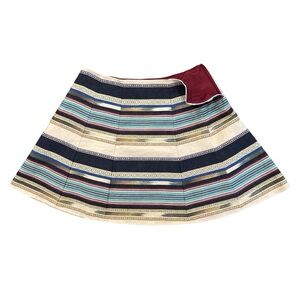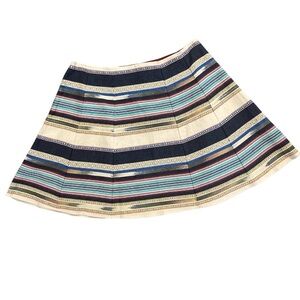 Anthropologie x Chloe Oliver Hayley Skater multi-colored, striped mini skirt. It features a gored design with pleats and a high waist. The skirt incorporates various horizontal stripes in different colors and patterns, including a band of geometric "X" and "O" designs. The material appears is a serape-style fabric. Skirt is lined with side zip and hook and eye close.