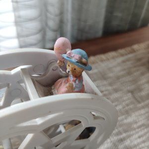 Beautiful Resin Ferris Wheel Musical Box, with Moving Rotating Wheel and Seats with Anthropomorphic Bears. Plays Classic Brahms Lullaby, 8.5 inches in height, base 4 7/8 inches in diameter, Wheel 5 inches in width, Very Good Vintage Condition, no chips, no cracks, Please see pictures for further details